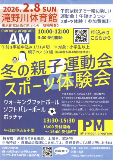 北区スポーツ推進委員協議会では2月8日に「冬の親子運動会」&「スポーツ体験会」の2つのイベントを開催します。